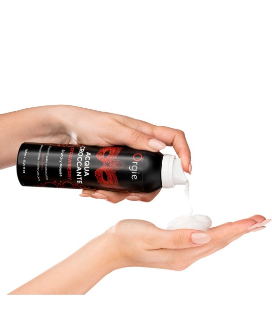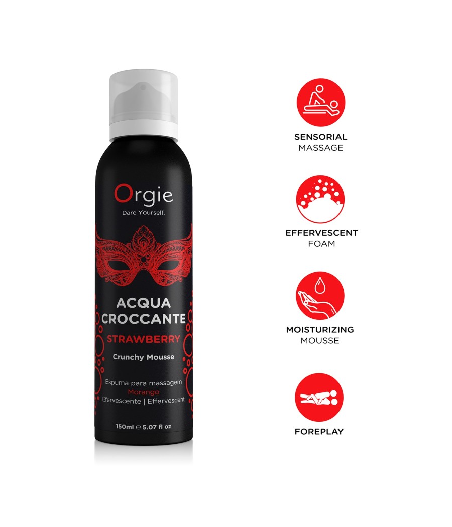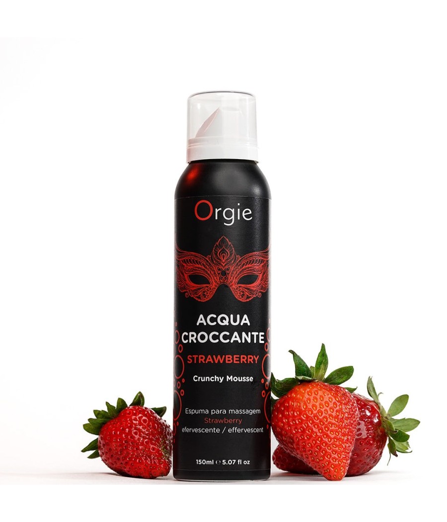 Acqua Croccante es una espuma hidratante y efervescente, con delicioso aroma a Fresa, que al aplicarse sobre la piel y bajo la suave presión de sus manos, provoca efervescencia: las pequeñas burbujas que están en la espuma explotan y causan una experiencia única, súper excitante y agradable.